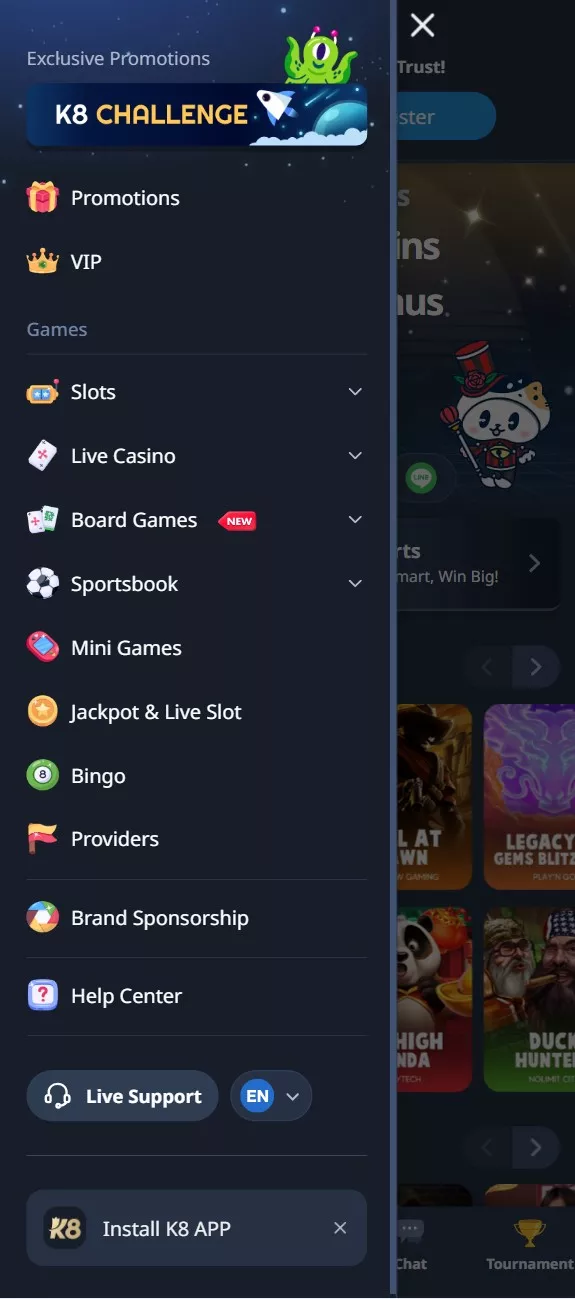 Indian players enjoy K8's huge selection of sports events and casino entertainment. Major global fixtures and local stars, top odds, numerous bets, and a vibrant Live zone!